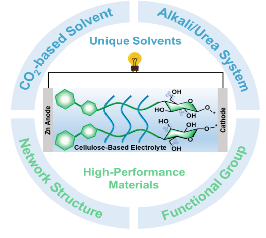 基于此,周金平教授团队与谢海波教授团队系统总结了近年来在纤维素基电解质的设计与合成方面的研究工作。文章首先详细介绍了课题组前期开发的两种新型纤维素溶剂体系,即碱/尿素水溶液与CO2基溶解体系,并阐明了其组成特点与溶解机制。在此基础上,作者以这两种溶剂作为纤维素的溶解介质与反应介质,构建了多种结构可控、功能可调的纤维素电解质,具体包括三类网络结构设计策略(如柔性-刚性双网络结构、物理-化学双交联策略以及表面涂层工程)以及多种官能团修饰方法(如在纤维素分子链上引入负电荷、正电荷、两性基团及其他极性官能团),并揭示了以上结构设计与功能修饰对纤维素电解质力学性能和理化性质的调控机制与构效关系。进一步地,作者深入探讨了纤维素基电解质在水系锌电池中的电化学性能与作用机理。最后,总结了当前纤维素基电解质在水系锌电池应用中仍面临的关键挑战,并指出未来可在新型纤维素溶剂开发、超薄纤维素电解质结构设计及规模化高效制备技术等方向寻求突破。