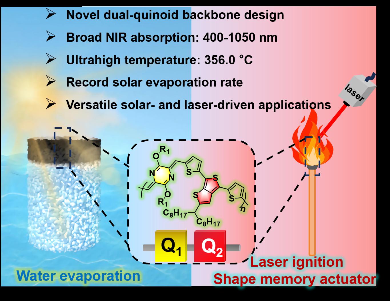 该研究报道了一种全新的分子设计策略:通过在共轭聚合物主链中同时引入醌式与预醌式单元,并协同运用侧链工程,成功构建了一类兼具宽谱太阳光吸收与激光共振响应特性的有机光热材料。该材料展现出优异的光热转化效率,可同时适用于太阳能海水淡化与激光驱动的高温应用场景,从而突破了有机光热材料在太阳光与激光双模式驱动下性能难以兼容的瓶颈。在808 nm激光照射下,材料温度可达356.0 °C,是目前各类光热材料中报道的最高温度之一,并展现出优异的光热稳定性,已成功应用于激光点火及形状记忆驱动等高温场景。此外,基于该材料构建的Janus界面蒸发器在模拟太阳光照下,实现了2.78 kg m‒2 h‒1的水蒸发速率,创下了纯有机光热材料的最高纪录。本研究提出的协同分子设计策略,成功构筑了兼具太阳光与激光双模式驱动的高效光热转换有机材料体系,为多功能光热聚合物在可持续能源利用与精密热管理领域的实际应用奠定了重要的理论基础。