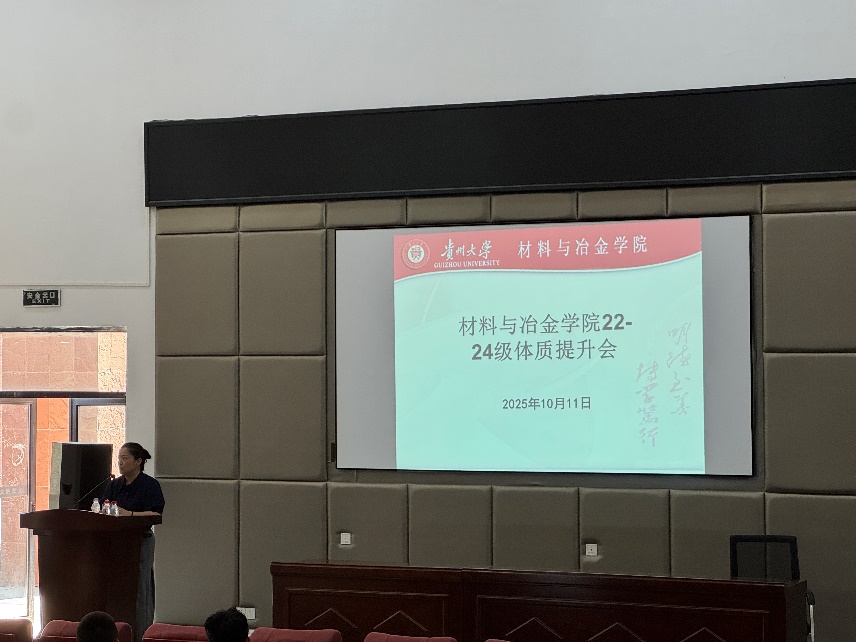 为进一步提升学生身体素质,营造体育锻炼的良好氛围,帮助同学们更好应对体测、养成健康生活习惯,2025年10月11日,贵州大学材料与冶金学院在学院报告厅召开体质提升专题会议,学院党委副书记王丽远、学院学生科科长王眉龙、体育专项工作教师张莹、学生代表参加会议。