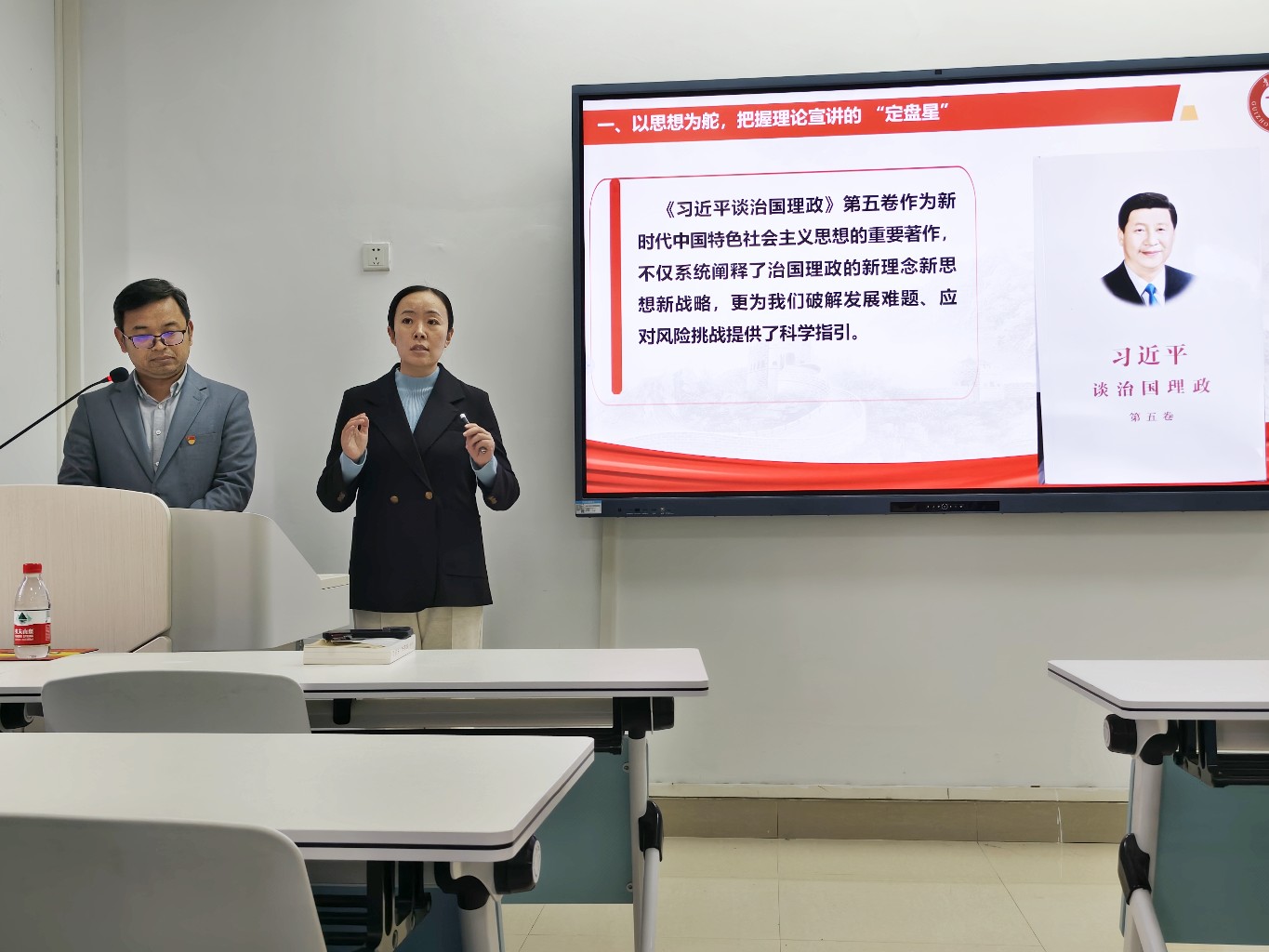 为深入学习《习近平谈治国理政》相关内容,引导青年学子在中国式现代化进程中找准定位、勇担使命, 2025年11月12日,在贵州大学材料与冶金学院523教室,贵州省委宣讲团成员、贵州大学材料与冶金学院辅导员李云,以及学院材料科学与工程教研室教工党支部书记万明攀以“理论宣传二人讲”形式,为2025级学子带来一场主题为“深入学习《习近平谈治国理政》第五卷相关内容在中国式现代化进程中贡献贵州‘钢铁人’的新力量”的宣讲,分别从思想引领、内涵阐释、实践赋能三维发力,让理论学习直抵人心!